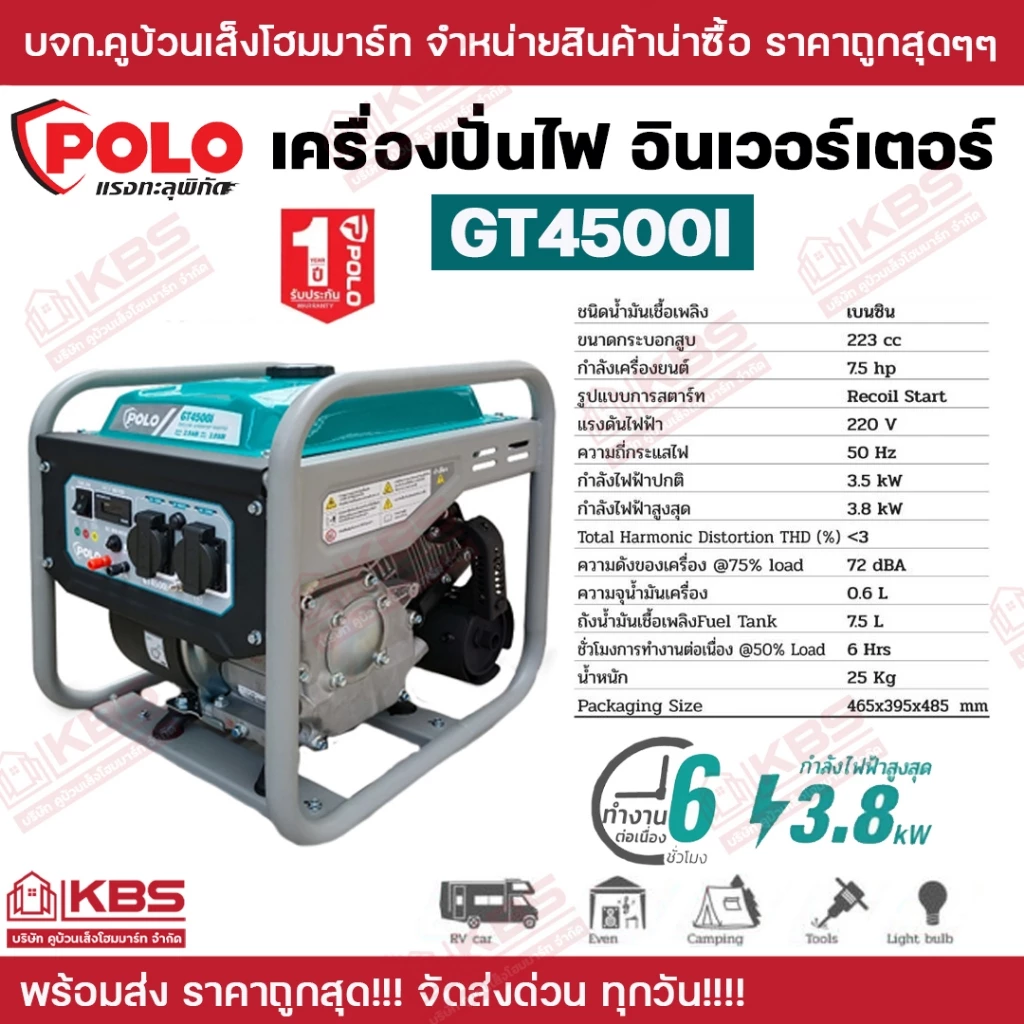 - Polo เครื่องปั่นไฟ กำลังไฟฟ้า 3.5 กิโลวัตต์ รุ่น GT4500I